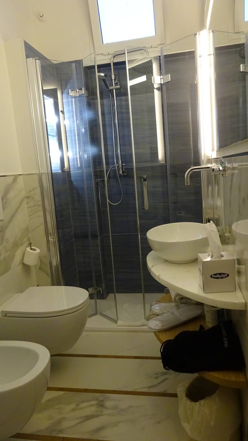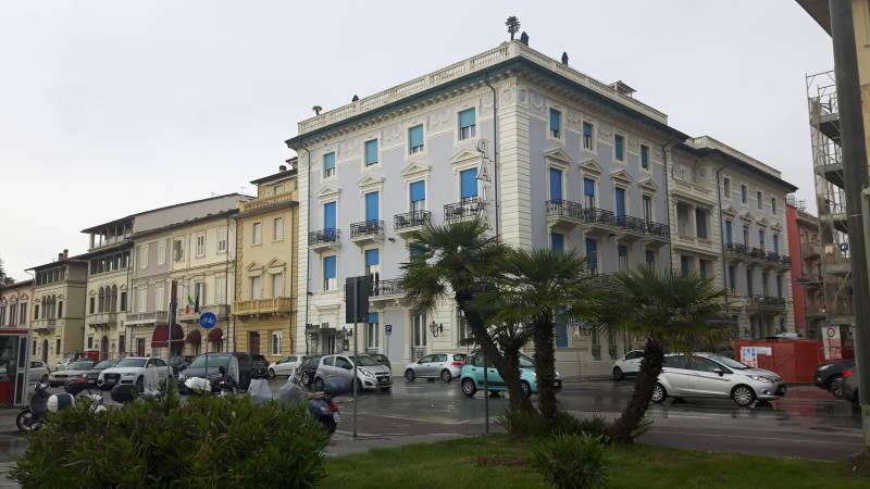 Na de rit van nauwelijks 15 minuten ben ik in Viareggio, beroemd vanwege zijn lange promenade, brede strand, het Carnaval en de uitstekende restaurants. Ik heb al op Google gezien hoe ik moet lopen, de route is simpel… Ik ben ondanks de donkere wolken in een opperbest humeur en loop vrijwel feilloos richting hotel. Het is toch wel iets verder lopen dan ik dacht trouwens, maar goed. De regen is inmiddels wel hardnekkiger geworden en de boulevard ligt er wat treurig bij nu. Ik besluit maar snel in te checken in Hotel Palace, met de bijna lichtgevende wit met blauwe gevel. De man achter de balie komt wat streng over, maar is erg netjes en legt me alles heel duidelijk uit; welke kamer, waar is de lift, en waar en wanner het ontbijt en het restaurant is. Overigens vind ik het hotel meteen fantastisch en ben ik erg benieuwd naar mijn kamer. Ik word niet teleurgesteld, echt helemaal te gek! Zit wel aan de achterzijde, maar voor een 1 persoonskamer is het een paleisje. Mooi laminaat, moderne badkamer, dubbelbed, tv en een klassiek artdeco- achtige inrichting. Ik ga me maar even opfrissen en omkleden. Helaas tikt de regen steeds gestager op de ramen. En wanneer ik wil gaan eten plenst het werkelijk alle engelen de hemel uit. Dat doet me besluiten om dan de eerste avond maar in het hotel te eten. Het is nu echt niet de moeite om mezelf nat te laten regenen op zoek naar een tentje om te eten. Ik bestudeer ook het hotel nog wat nader. Artdeco en neoclassisme, maar wel stijlvol. Het geheel is niet te druk. De lobby is mooi, maar de stoelen lijken mij niet erg comfortabel iets te log allemaal. Het restaurant blijkt druk maar er is nog een plekje voor mij. Het bestellen gaat redelijk snel, maar het duurt bijna een uur voor ik mijn eten heb. Mijn wijn is al bijna op. Gelukkig had ik brood en olijfolie om mijn trek enigszins te stillen en de maaltijd stelt niet teleur. Een overheerlijke spaghetti carbonara marinara, met veel vis en de saus is verrukkelijk. Ik raak in gesprek met een alleraardigst ouder koppel uit Ierland. Echt leuke mensen.