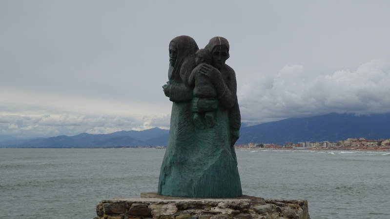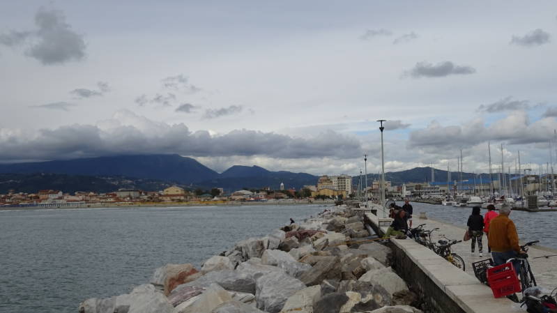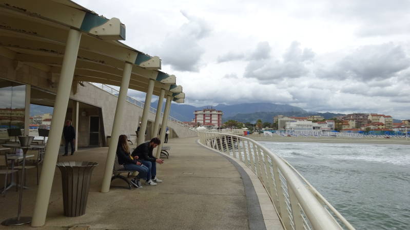 Na mijn wandeling door het park, loop ik weer door naar de boulevard en ga een stuk in de richting van Lido di Camaiore, maar veel is nog gesloten en men is druk doende om alles weer op te knappen. De pier is wel geopend, er is een bar en koffie, maar ik vind het net even te koud en te winderig nog om daar te zitten. Wel leuk om even naar de surfers te kijken die een kans wagen op de golven.