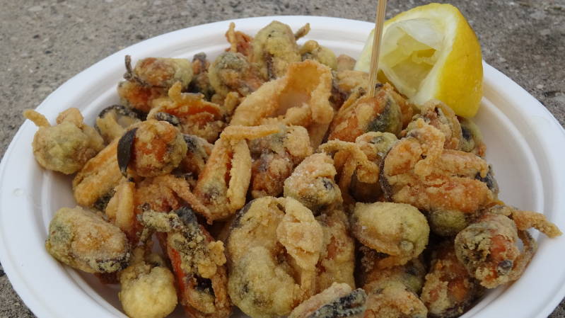 Ik besluit een lekkere snack te halen bij het vissersbootje met verse gefrituurde vis. Een portie mosselen. Het is overheerlijk, maar ik merk wel dat mijn maag wat protesteert. Te vet… Ik neem nog een drankje en later in de avond sluit ik af met een simpele pasta ravioli met salie.